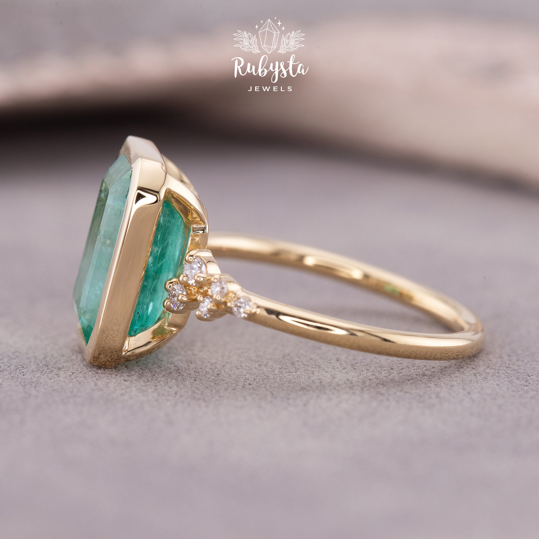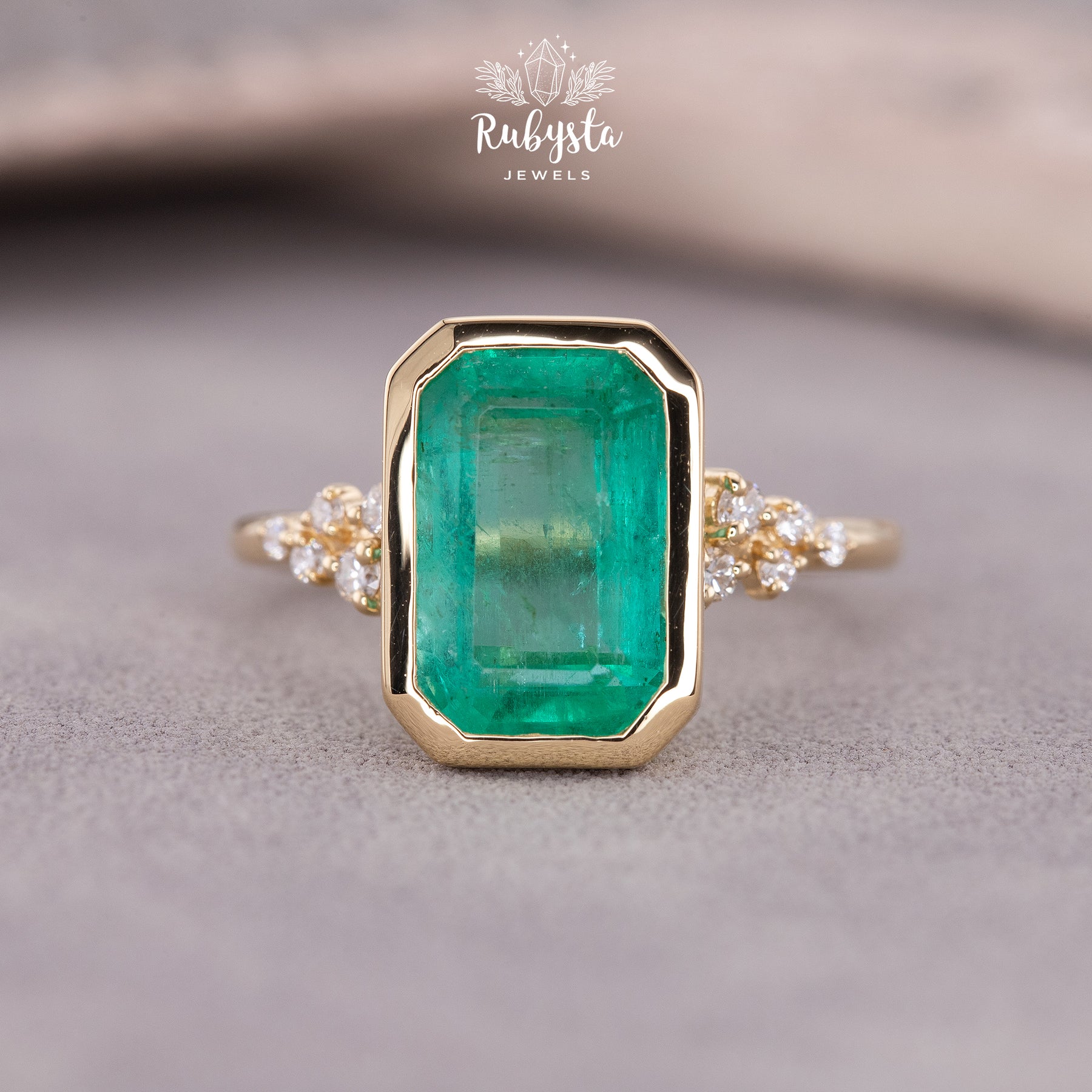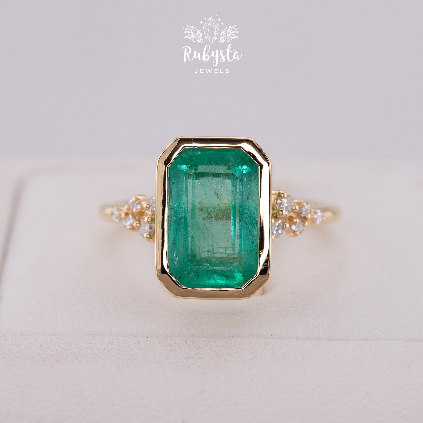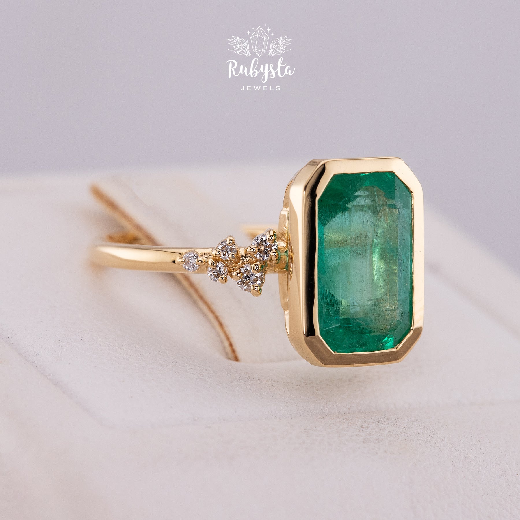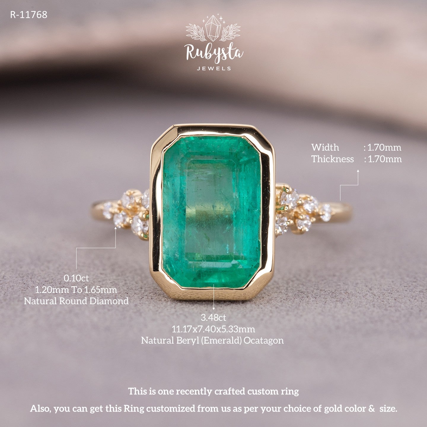 A bold celebration of color and craftsmanship, this 3.48ct Natural Emerald ring showcases a magnificent octagon-cut beryl set within a refined gold bezel. Its clean geometry highlights the stone’s vivid green depth, while delicate round diamond accents add understated brilliance along the band.