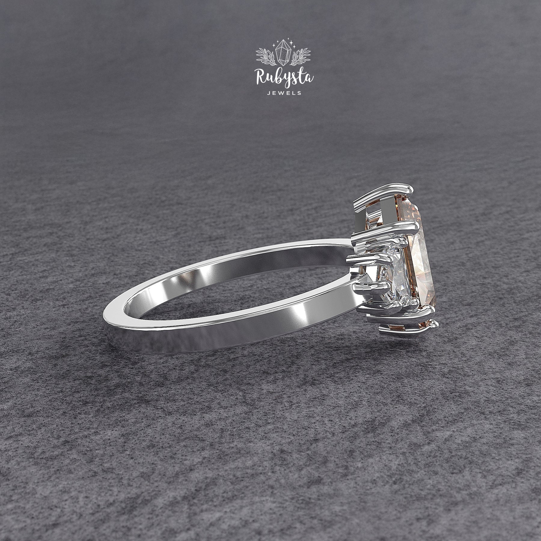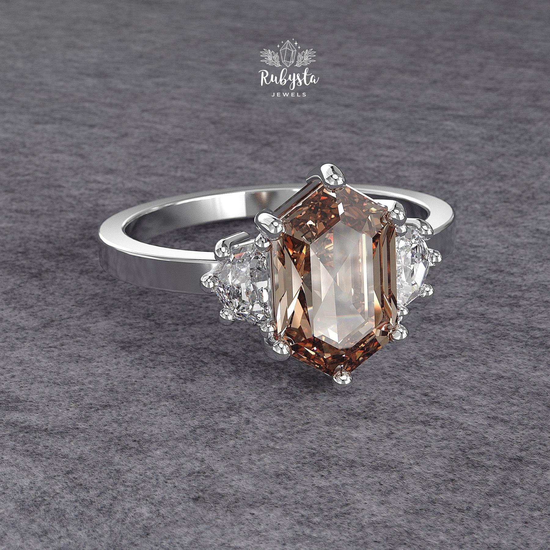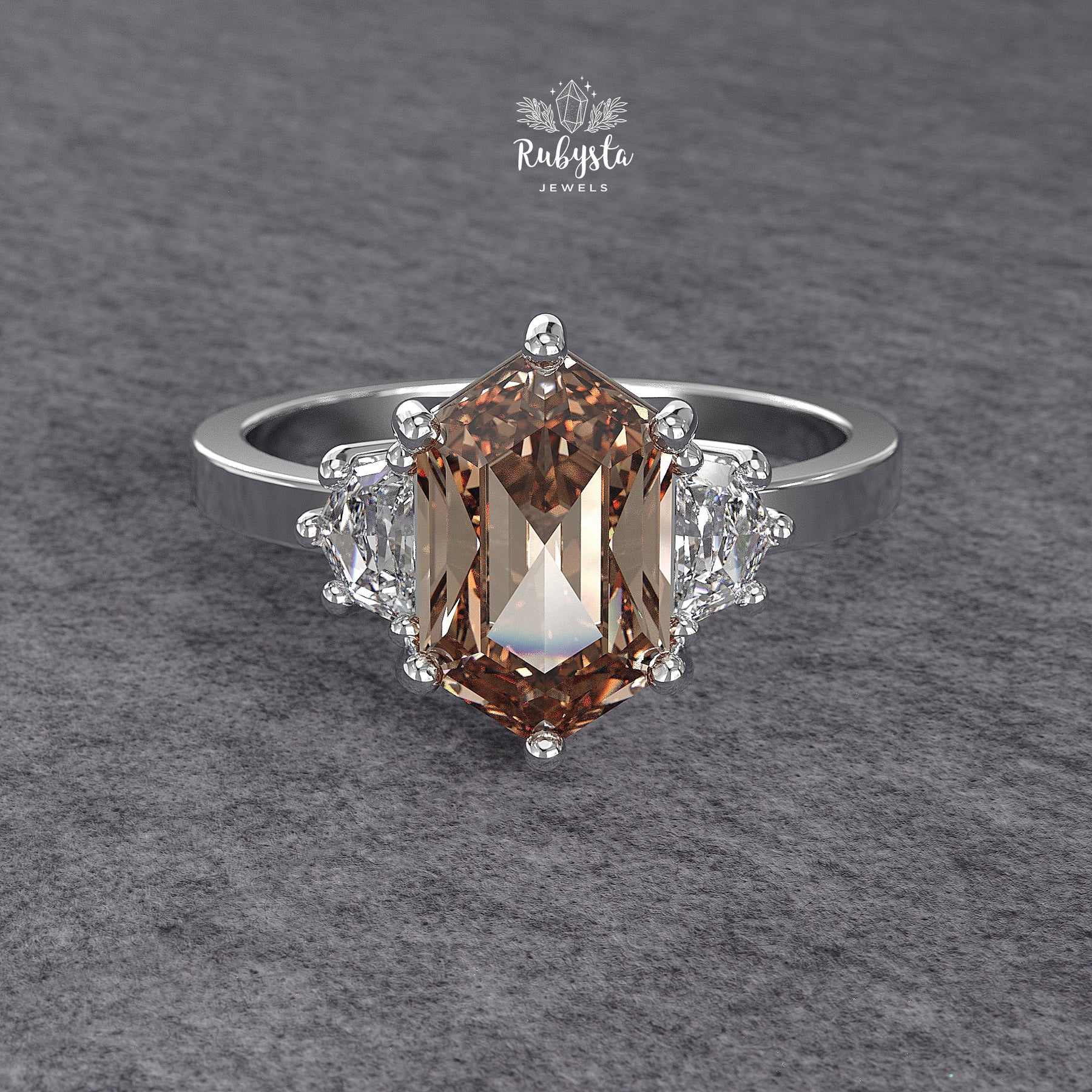 A celebration of modern geometry and warm, earthy brilliance, this Fancy Brown Hexagon Lab-Grown Diamond Engagement Ring is thoughtfully handcrafted by Rubysta Jewelry in Bangkok. The striking 1.50ct hexagon center stone captures the eye with its rich brown hue, perfectly complemented by two trapezoid lab-grown diamonds for a refined three-stone silhouette.