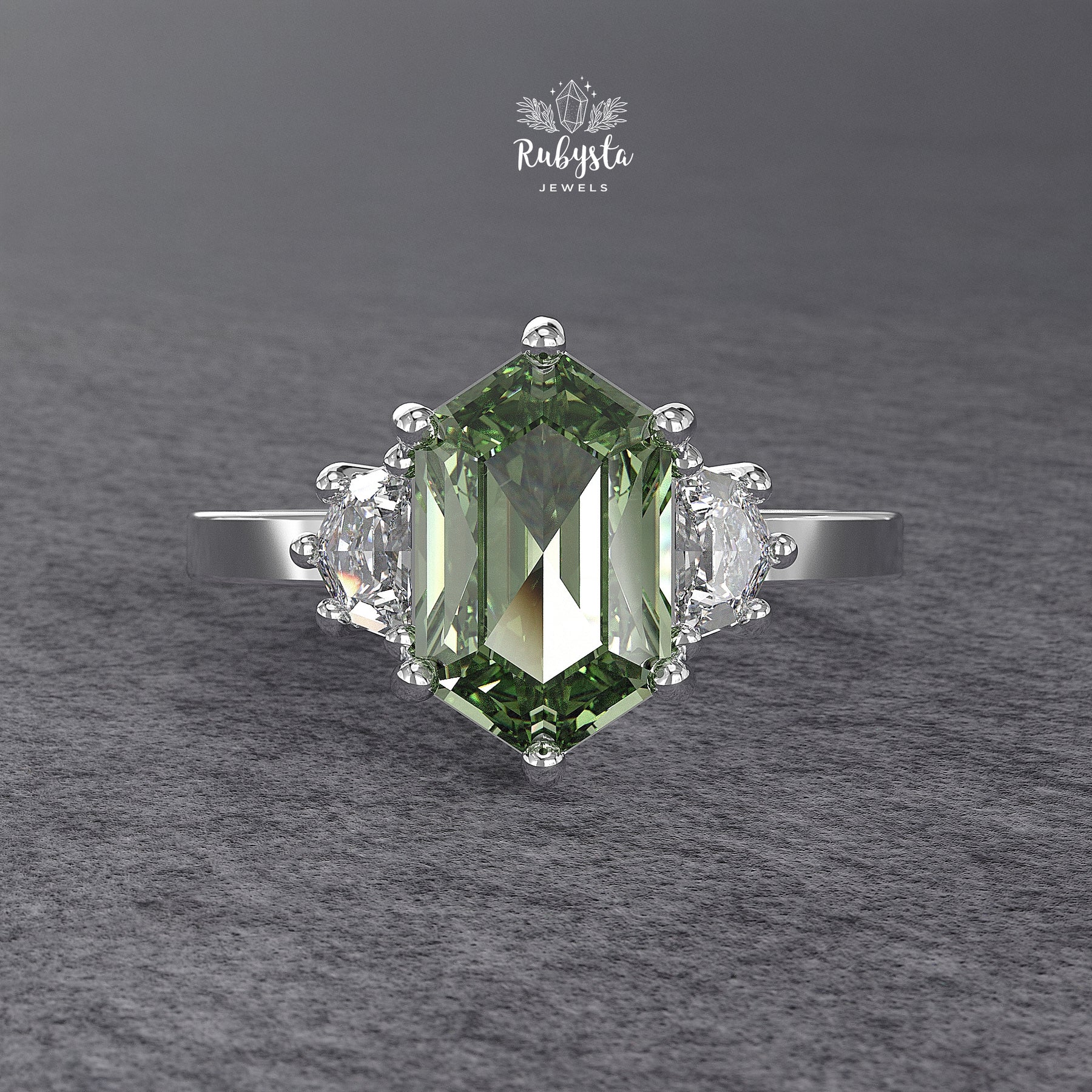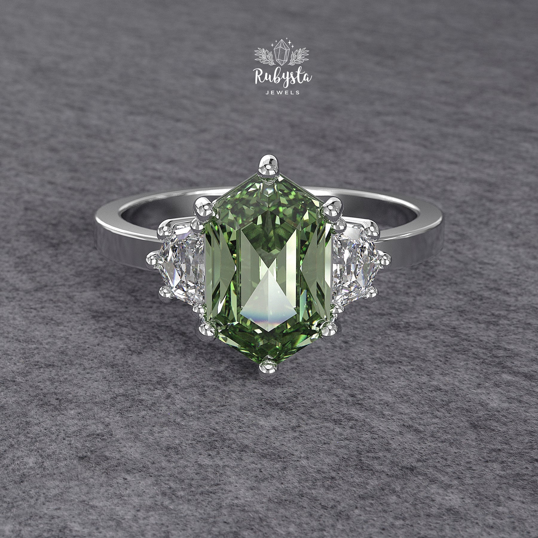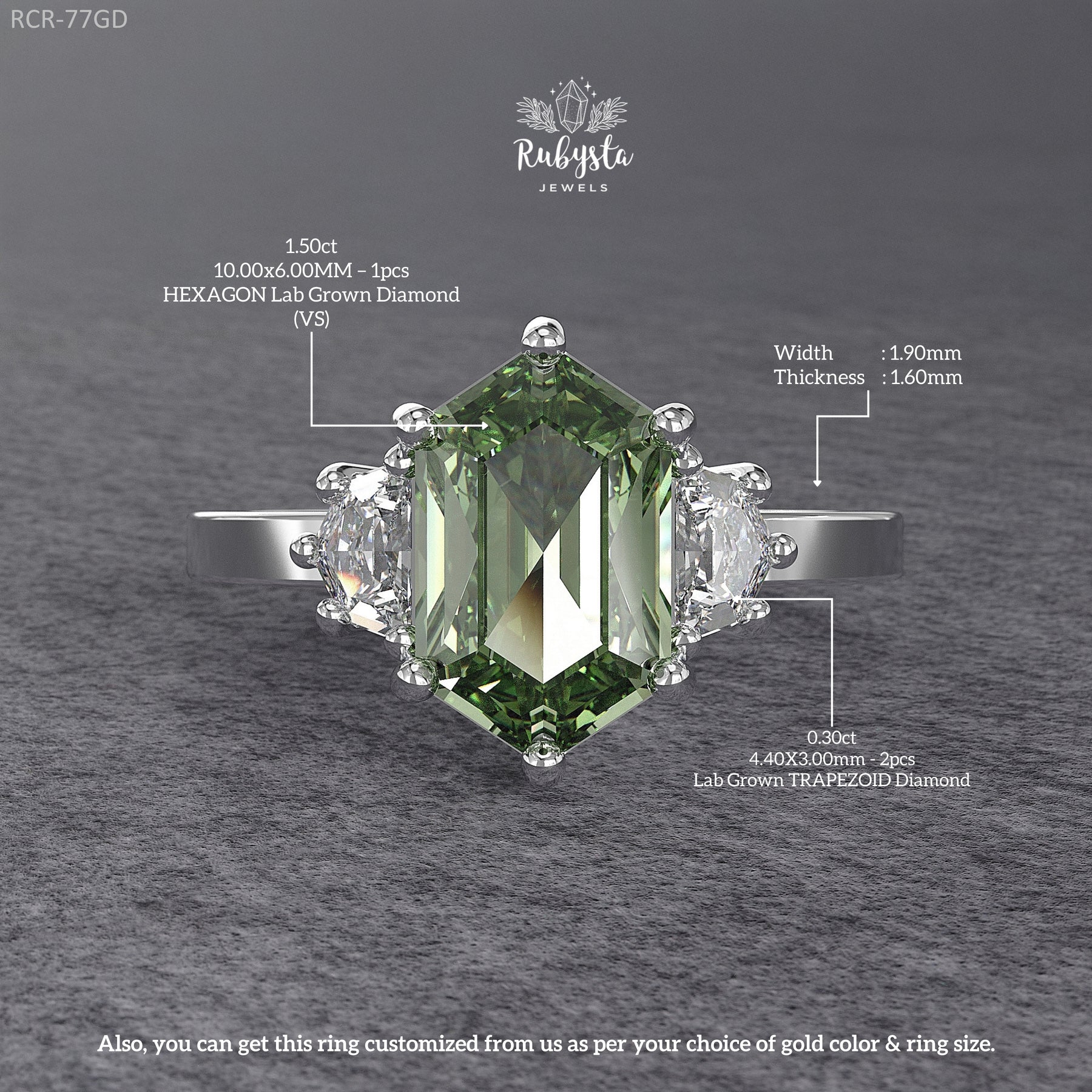 A bold, modern expression of love — this Green Hexagon Lab-Grown Diamond Three-Stone Engagement Ring is handcrafted by Rubysta Jewelry with exceptional Bangkok artistry. Designed for those who desire something striking yet refined, the ring features a radiant 1.50ct green hexagon diamond framed by two perfectly cut trapezoid side stones that enhance its symmetry and brilliance.