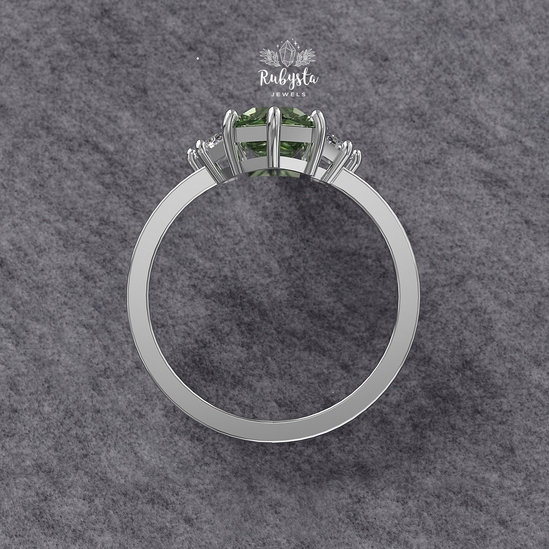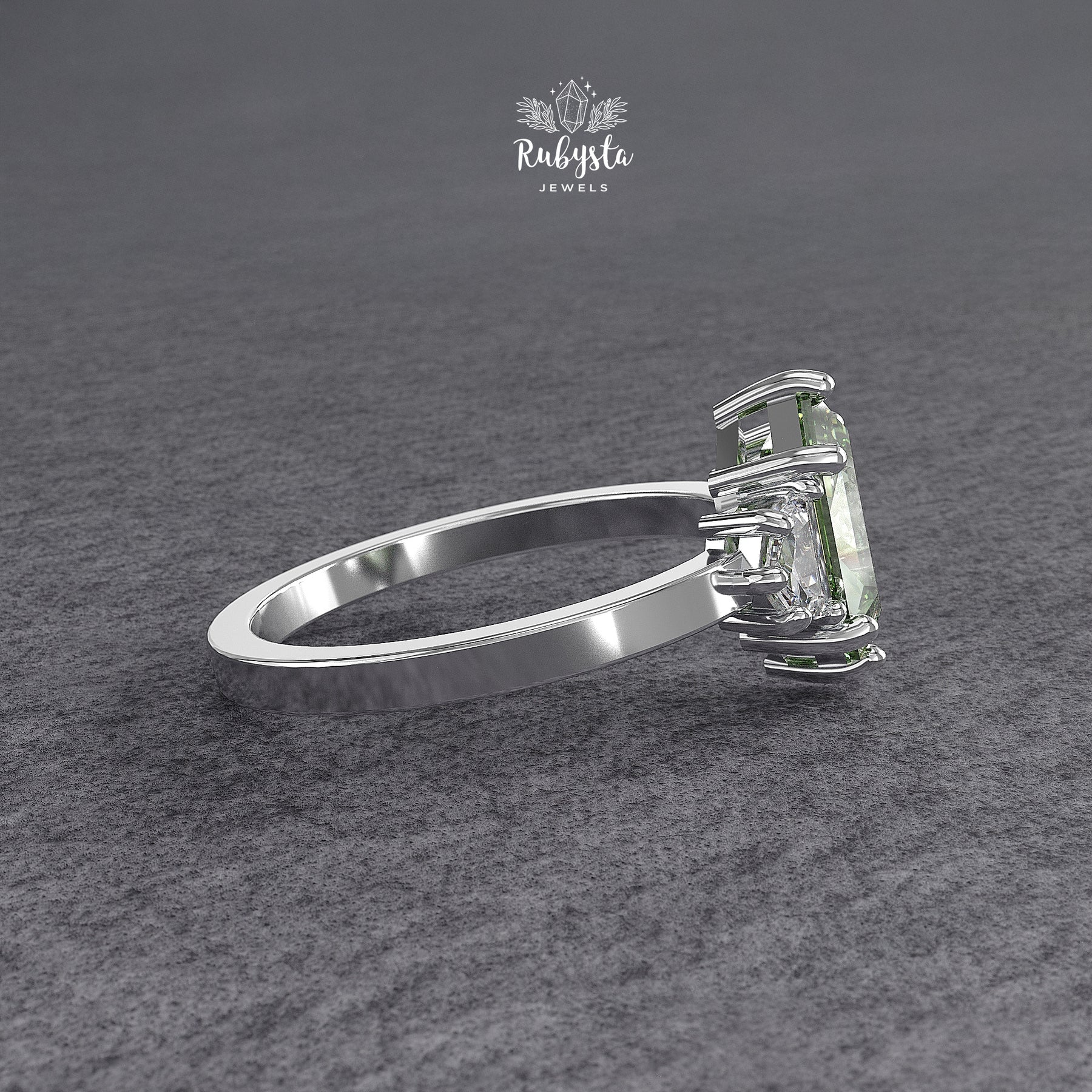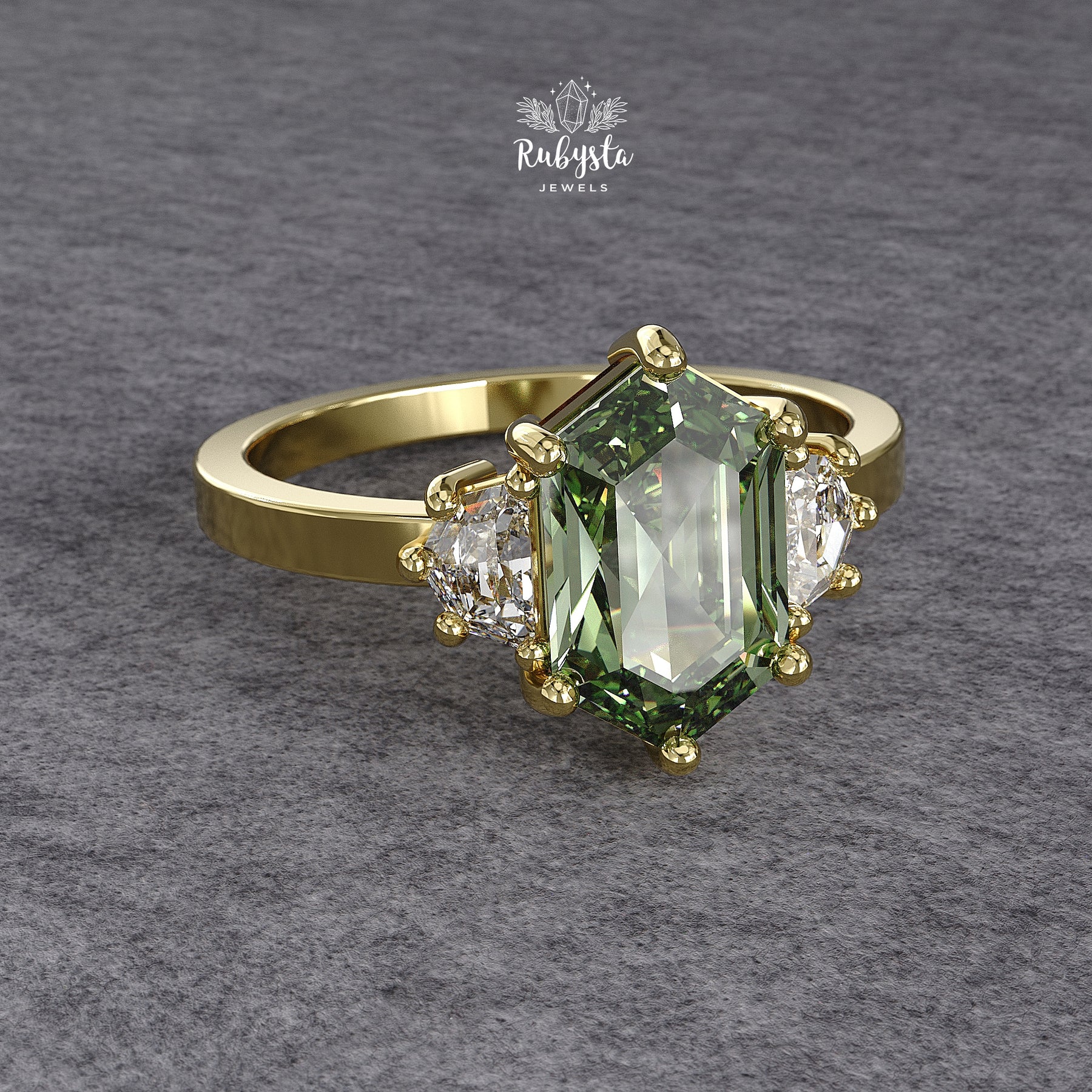 A bold, modern expression of love — this Green Hexagon Lab-Grown Diamond Three-Stone Engagement Ring is handcrafted by Rubysta Jewelry with exceptional Bangkok artistry. Designed for those who desire something striking yet refined, the ring features a radiant 1.50ct green hexagon diamond framed by two perfectly cut trapezoid side stones that enhance its symmetry and brilliance.