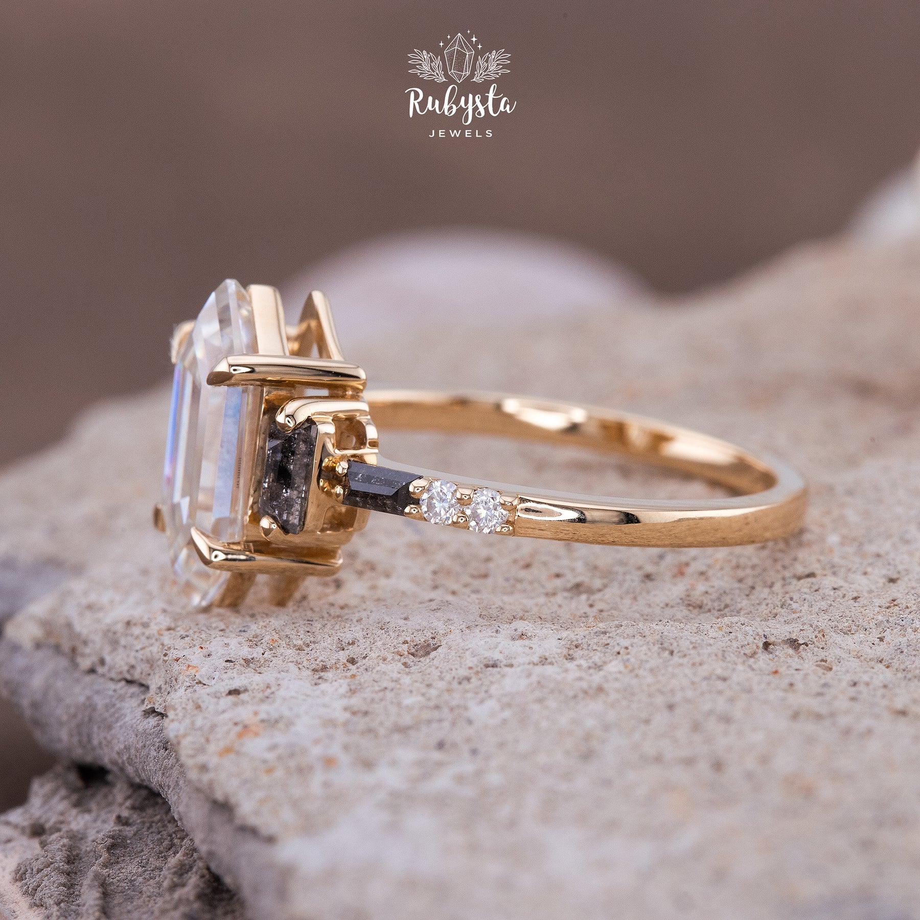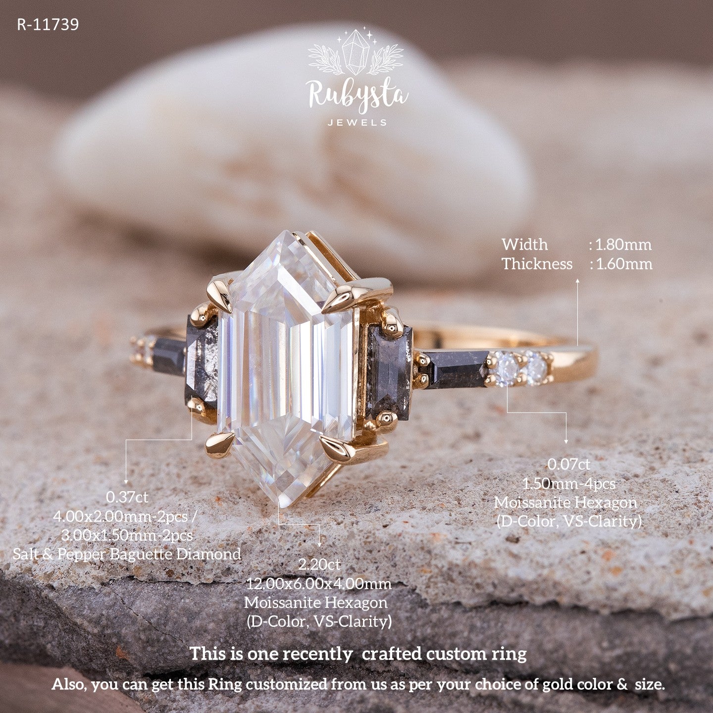 At its center sits a striking 2.20 carat D-color VS-clarity hexagon moissanite, expertly cut to maximize brilliance and symmetry. Flanked by natural salt and pepper baguette diamonds, the design celebrates organic beauty and contemporary contrast, while delicate moissanite accents add a subtle sparkle along the band.