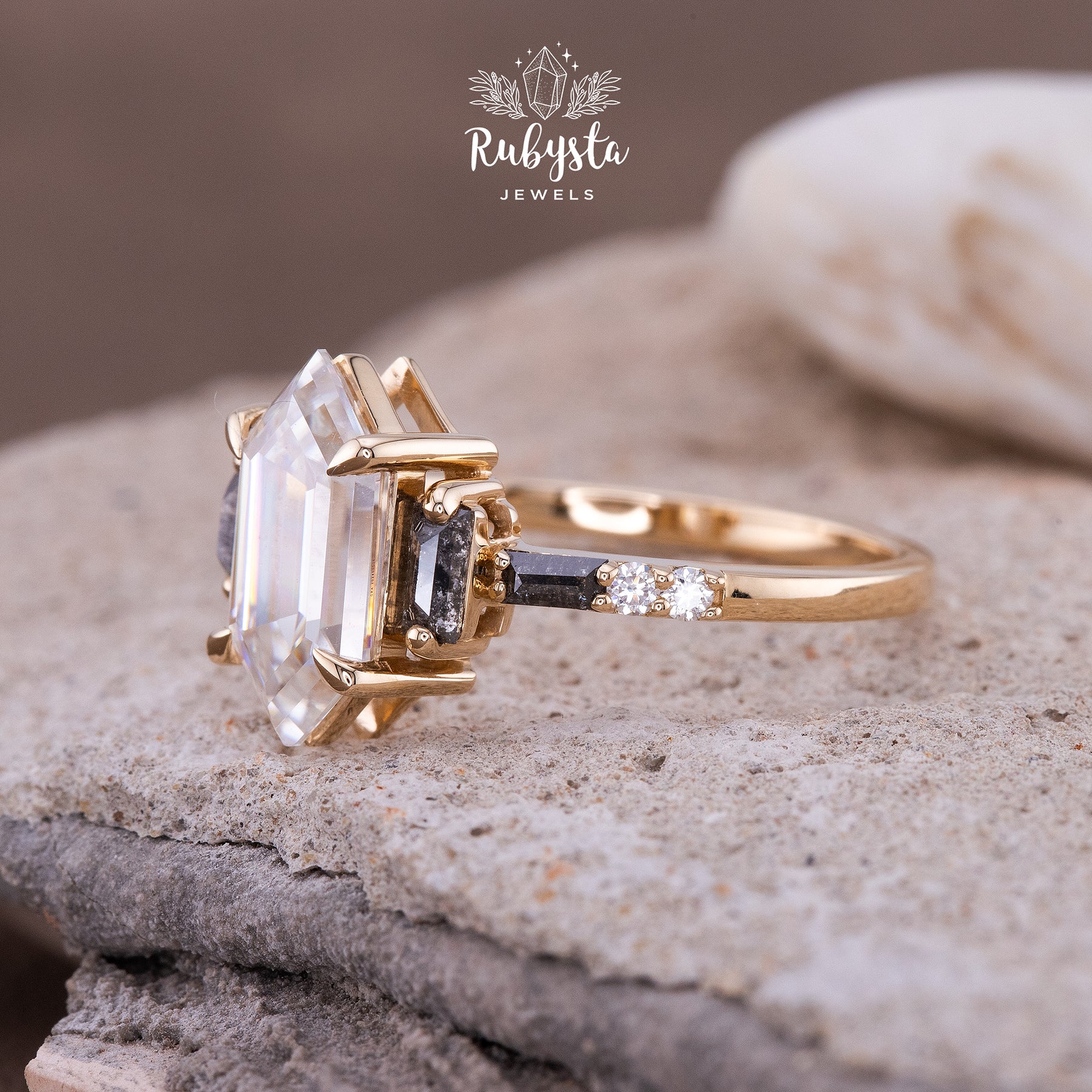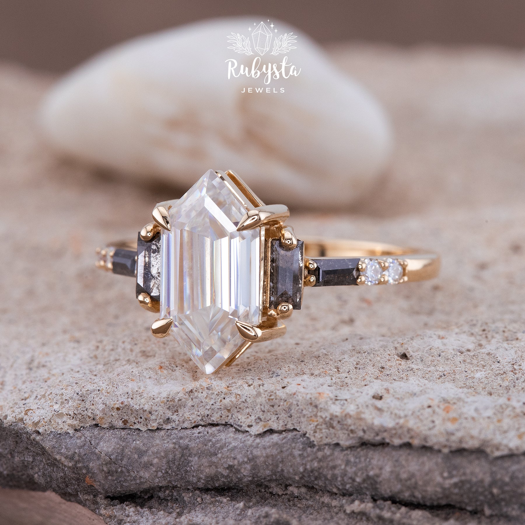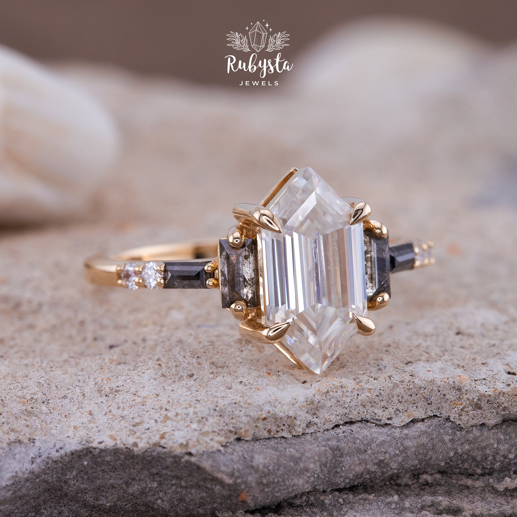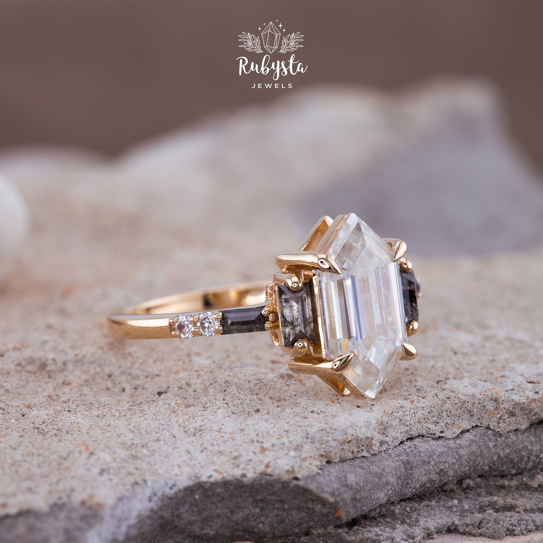Hexagon Moissanite & Salt and Pepper Diamond Engagement Ring