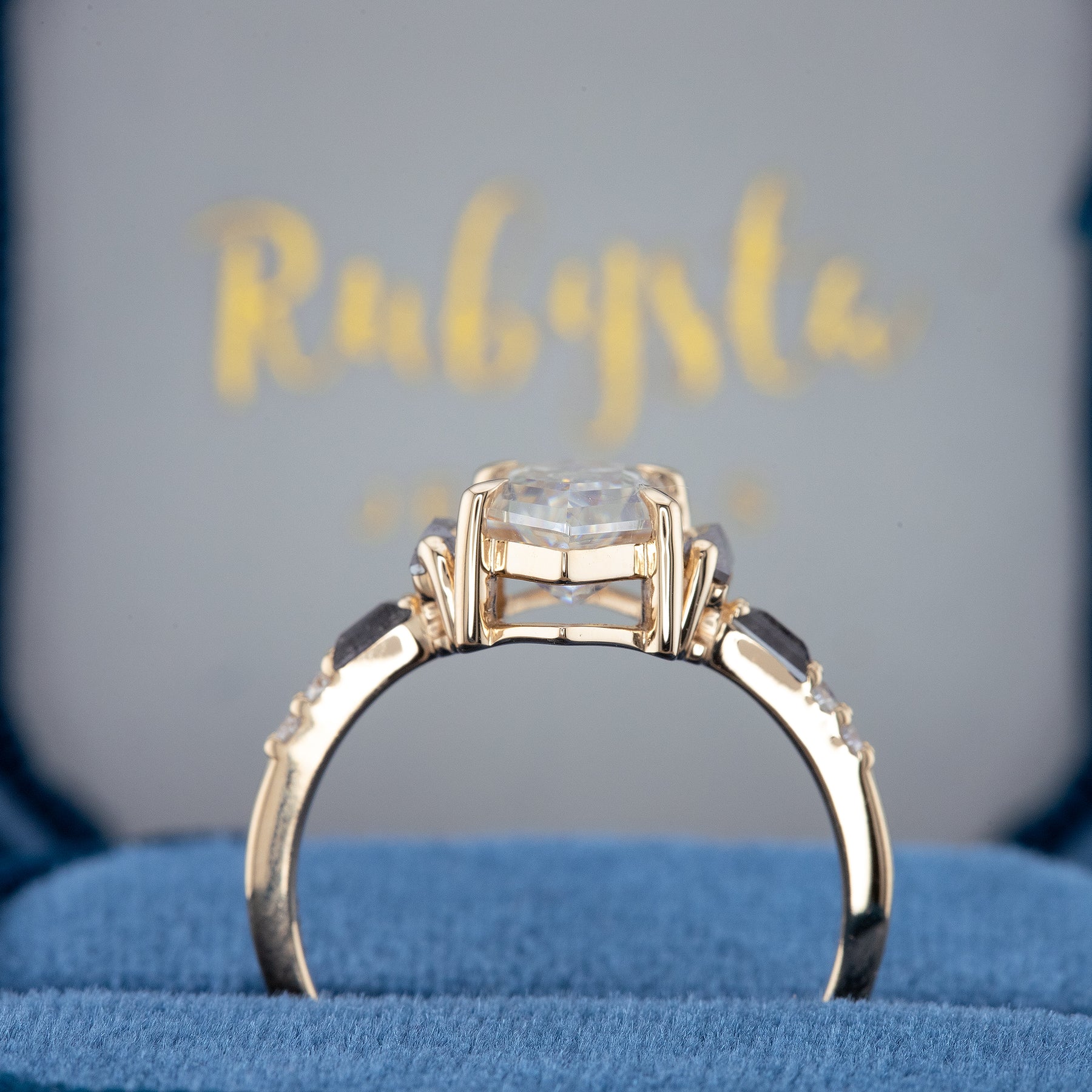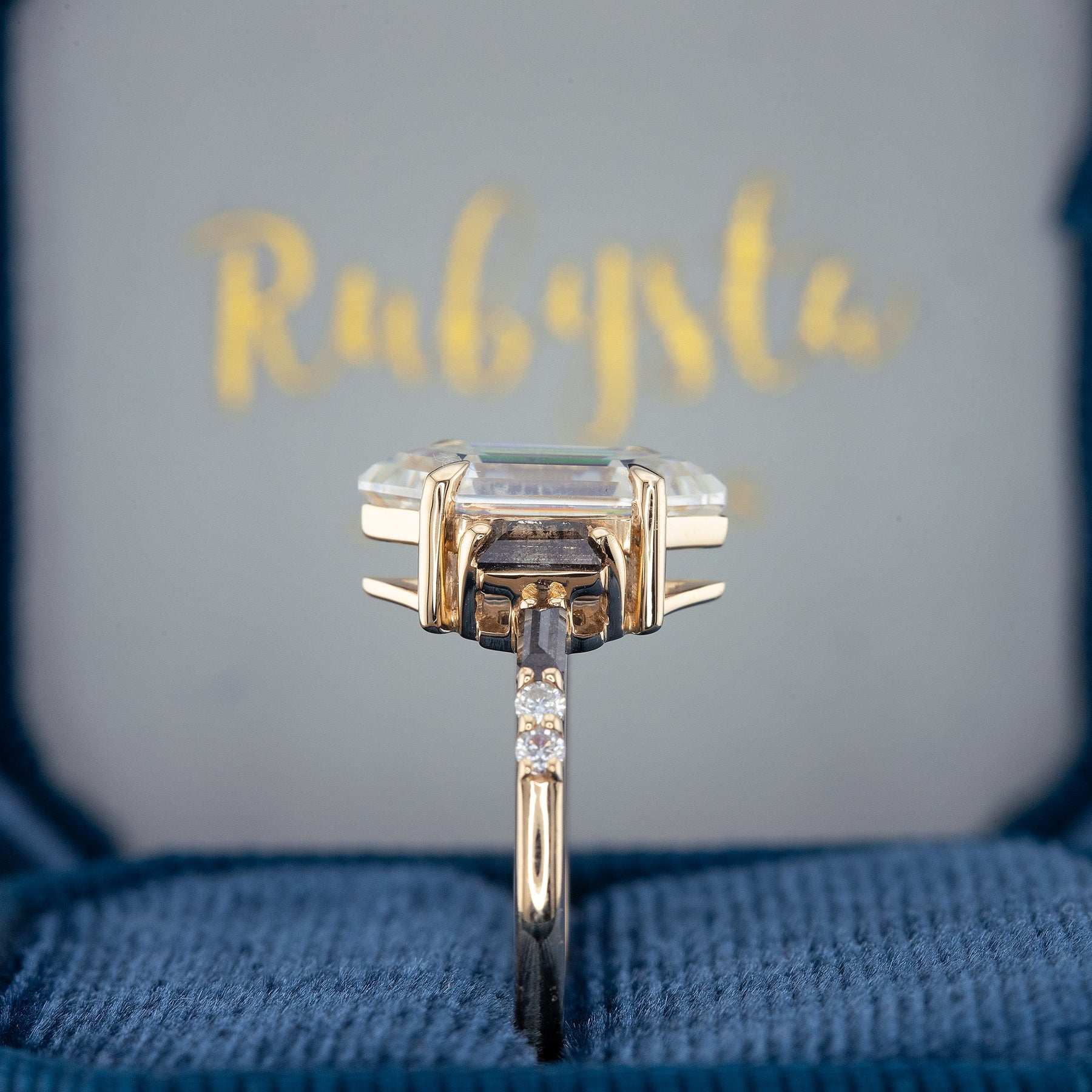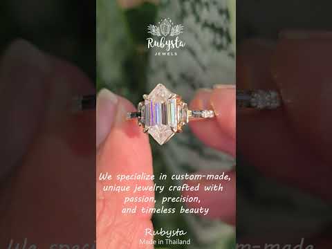 Bold geometry meets refined craftsmanship in this hexagon moissanite and salt and pepper diamond engagement ring—an elegant expression of individuality and modern love. Designed and handcrafted in Bangkok, this ring reflects Rubysta Jewelry’s commitment to precision, artistry, and ethical luxury.